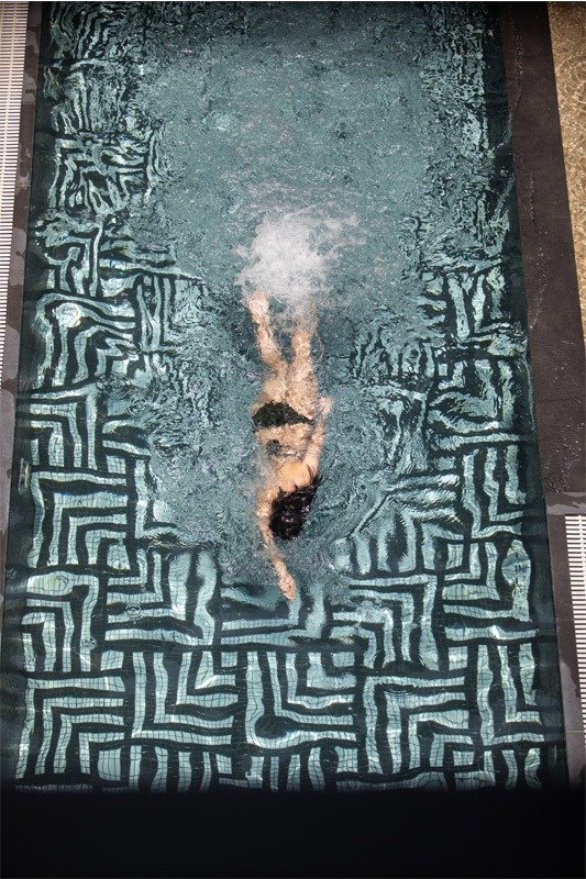 בריכת שחייה חיצונית המעוצבת עם אריחי פסיפס יוקרתיים.